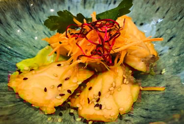 tofu fritto, wakame sunomono, con erba cipollina in salsa