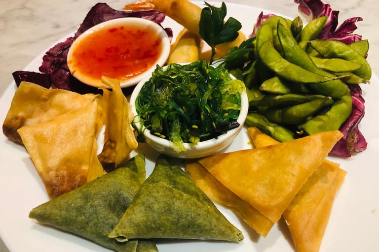antipasto misto con involtini fritti, fagioli di soia, insalata di alghe giapponesi, saccottini