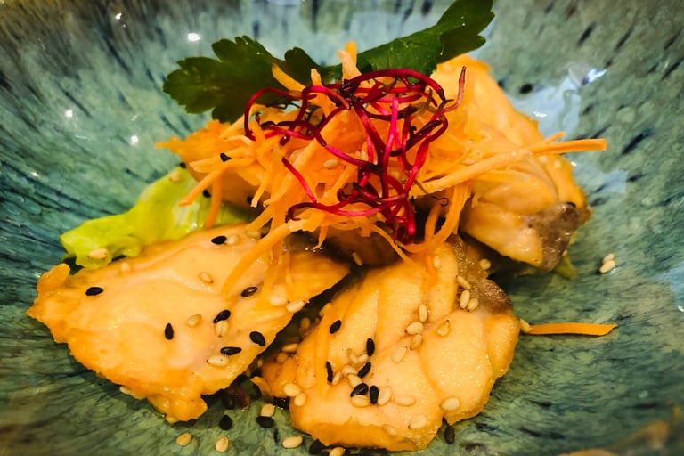 Salmone fritto marinato con aceto, sesamo e insalata