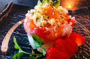 ciotola di riso con pesce misto tritato, avocado, tobiko