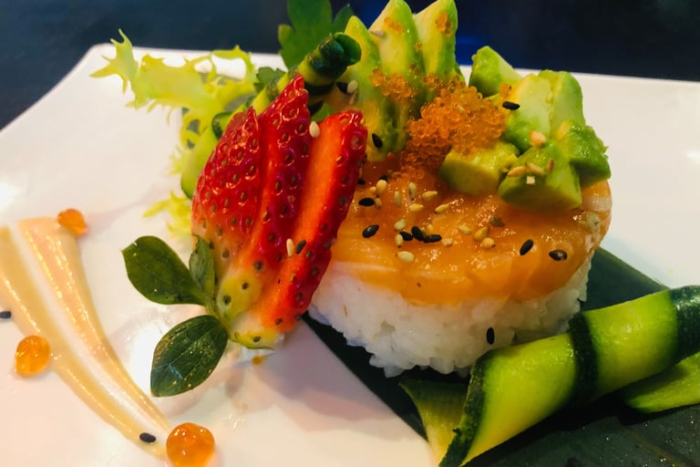 ciotola di riso con salmone crudo tritato, avocado, tobiko