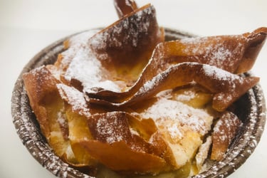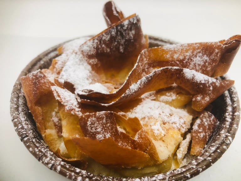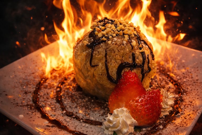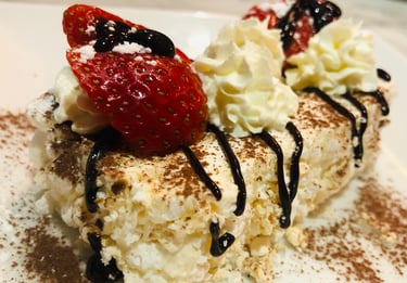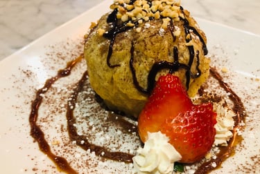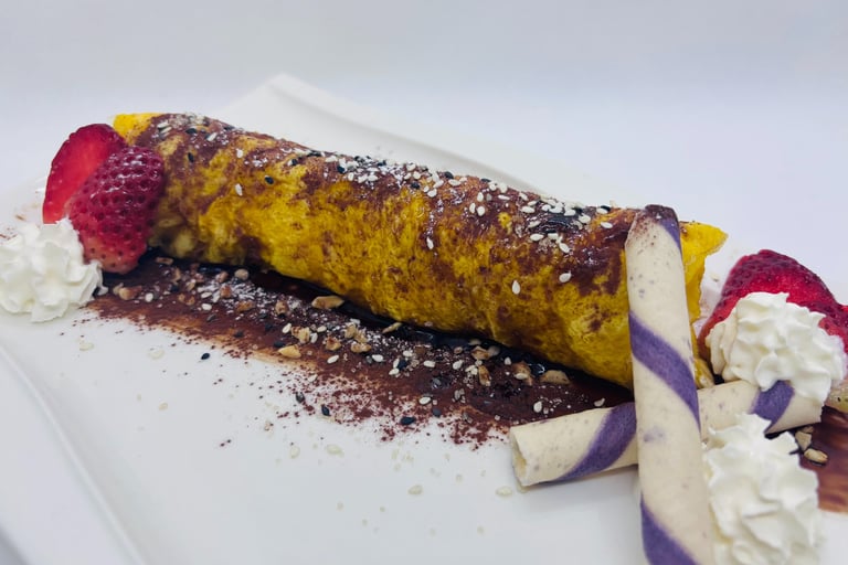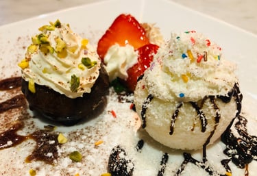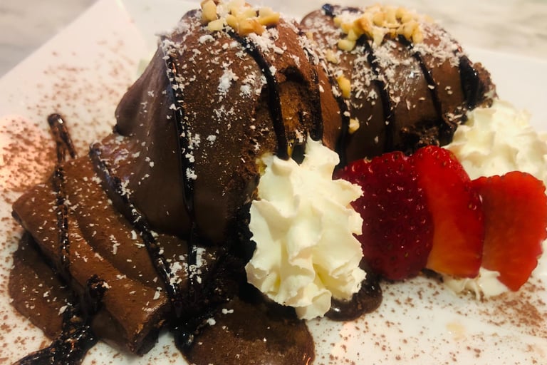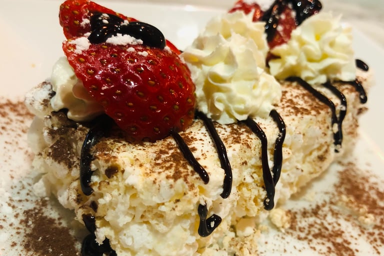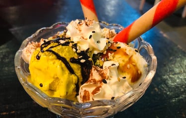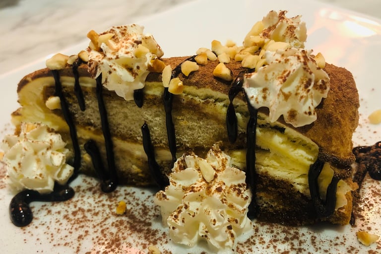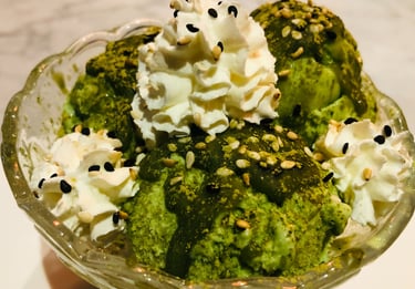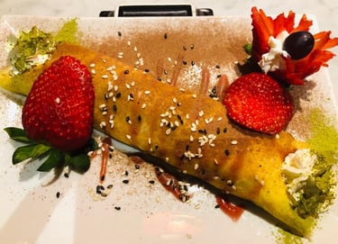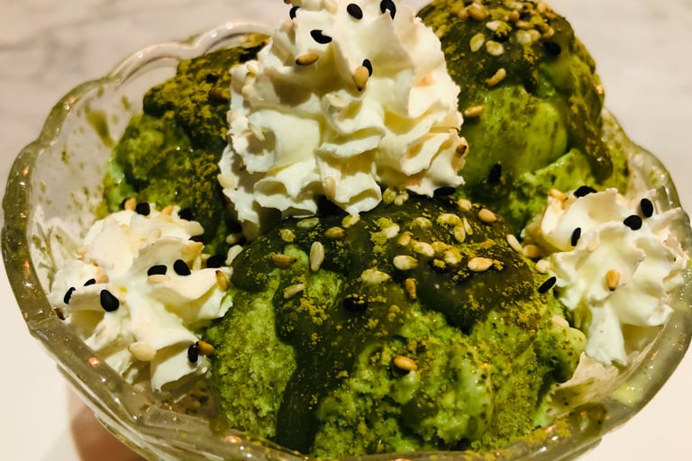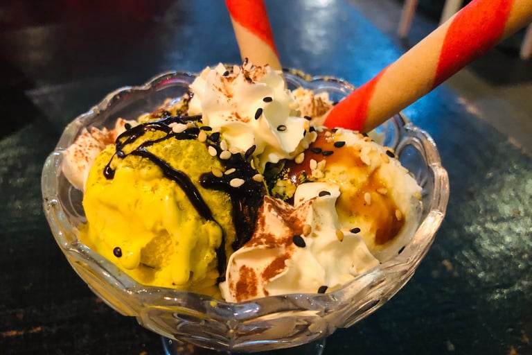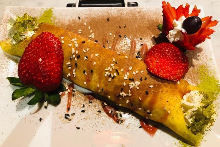 tutti i dolci sono decorati con topping, panna, sesamo o nocciola etc...