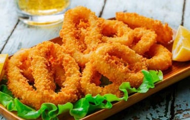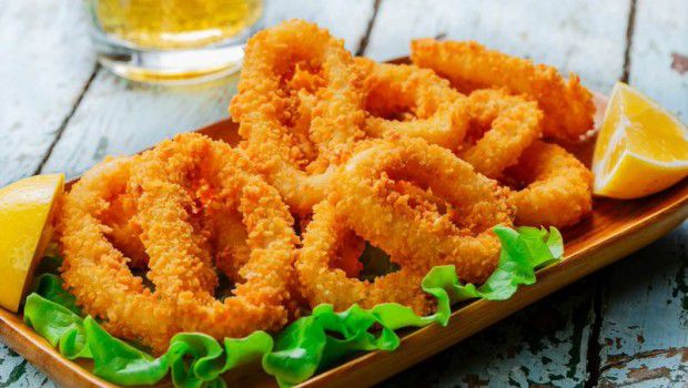 anelli di calamari fritti in tempura, uova, panko accompagnate con salsa agrodolce