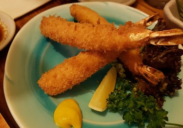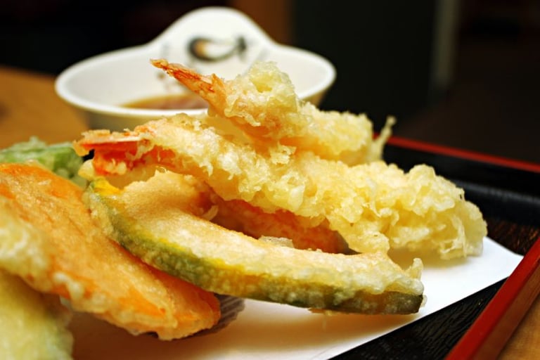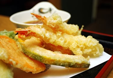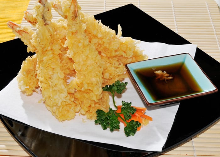 verdure e gamberoni fritti in tempura accompagnate con salsa agrodolce