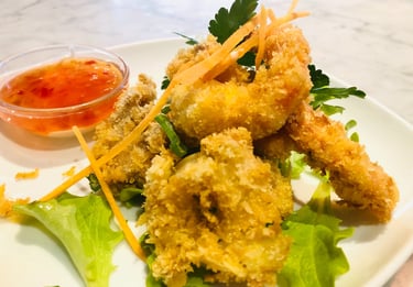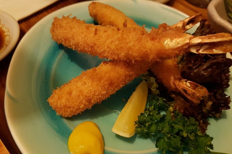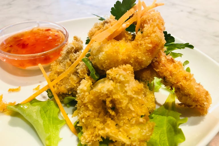 stick di mazzancolle impanate con panko fritte accompagnate con salsa agrodolce