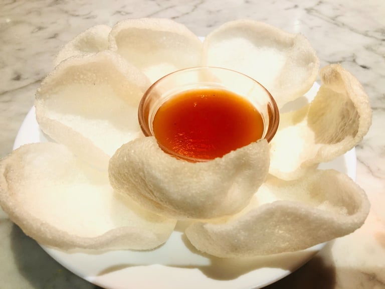 patatine aromatizzate ai gamberi, accompagnata con salsa agrodolce
