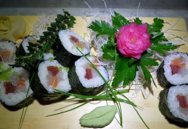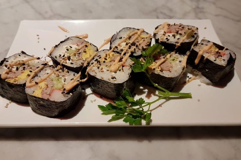Tonno cotto, cetriolo, sesamo, omelette, philadelphia e salsa rosa
