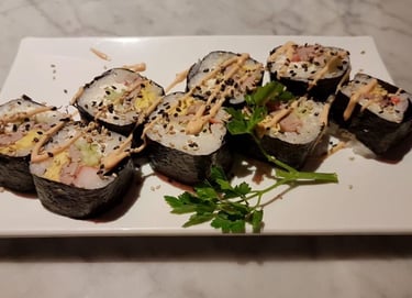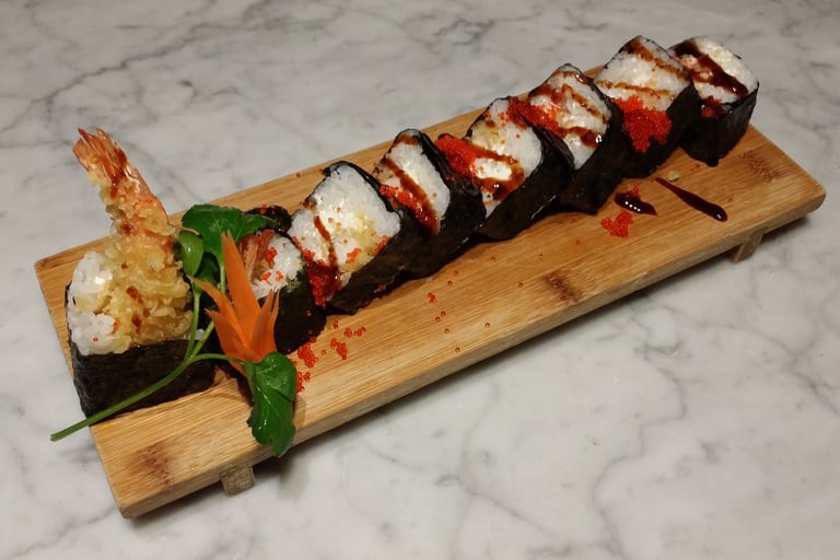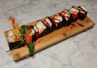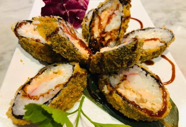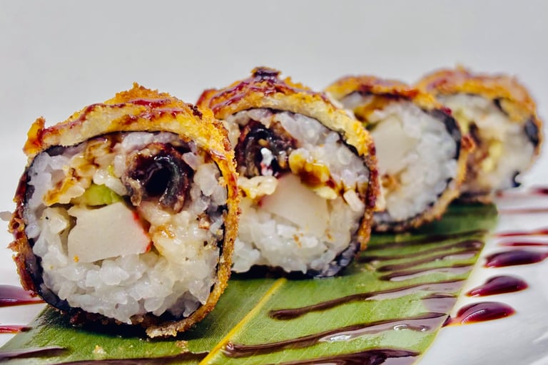 Anguilla cotto, gambero cotto, surimi, avocado in frittura con salsa teriyaki (max 2 porzioni)