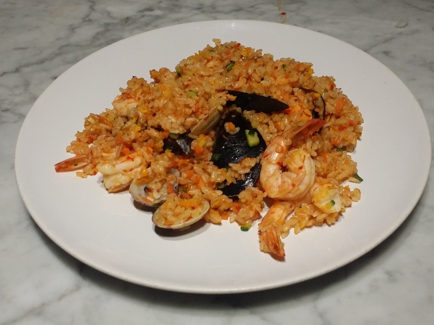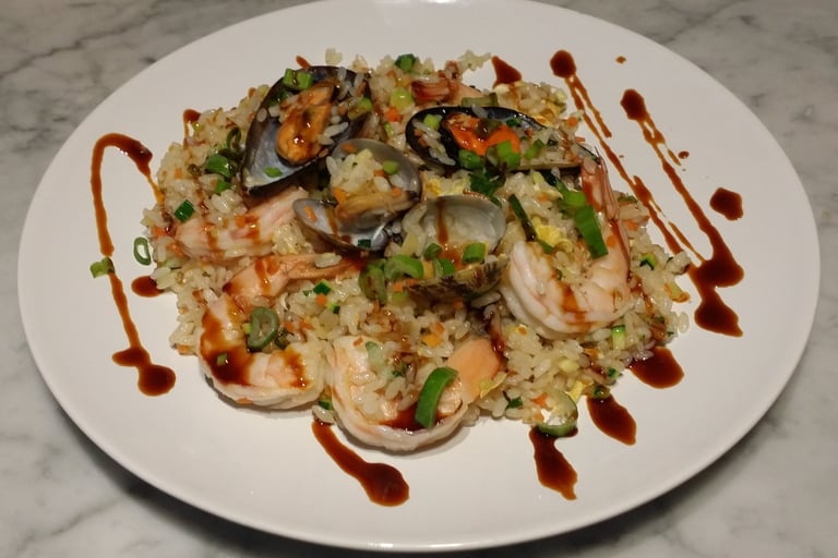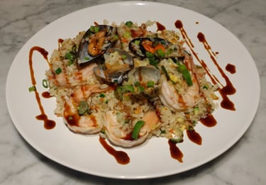 riso saltato con frutti di mare, verdure, uova e salsa piccante ( è possibile non mettere il surimi per chi è intollerante al GLUTINE specificando nella nota '' NO GLUTINE'' )