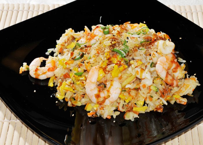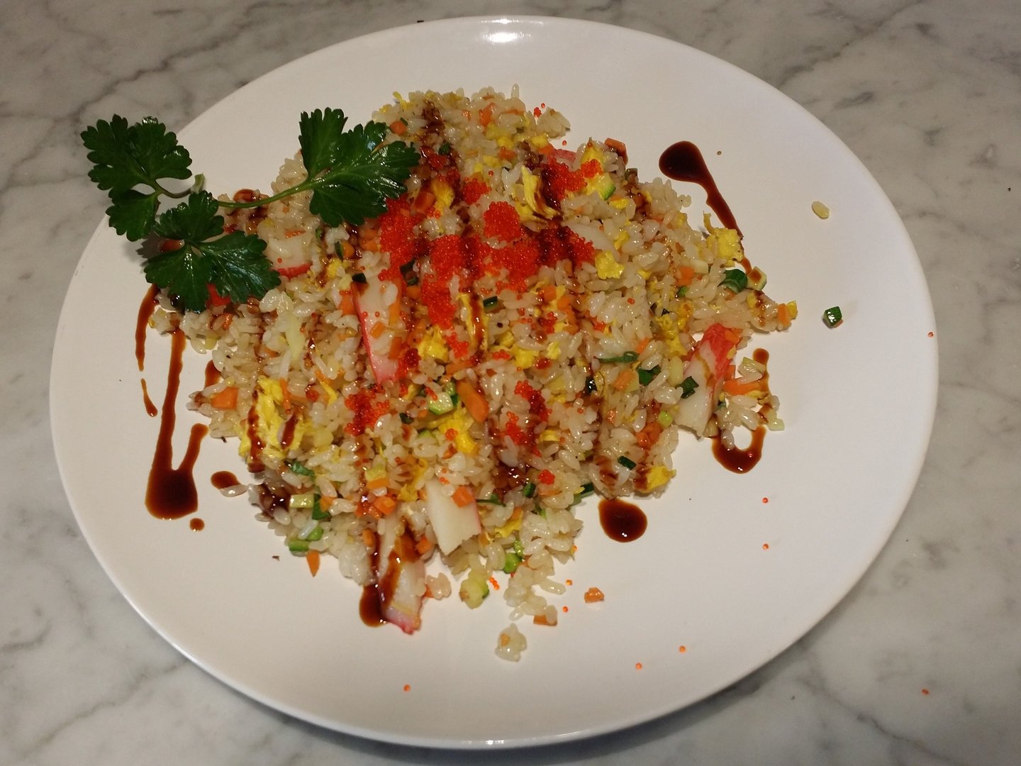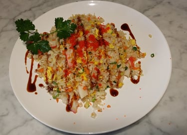 riso saltato con surimi, tobiko, verdure, uova e salsa teriyaki