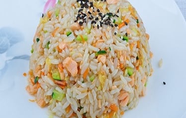 riso saltato con salmone, verdure, uova e salsa teriyaki ( è possibile non mettere la salsa per chi è intollerante al GLUTINE specificando nella nota '' NO GLUTINE'' )