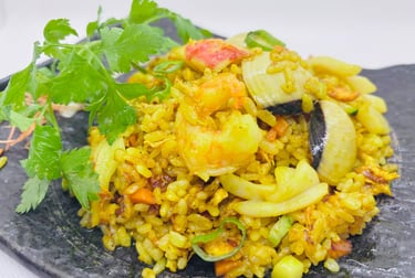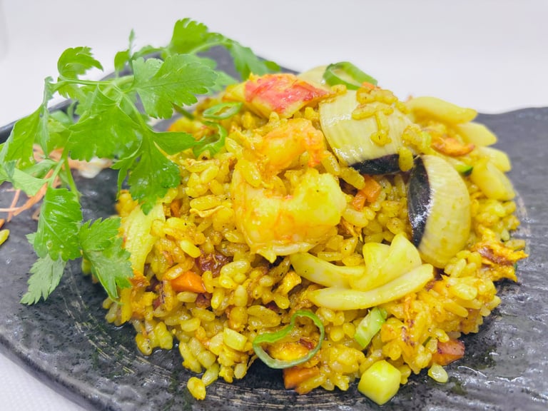 riso saltato con frutti di mare, verdure, uova e curry ( è possibile non mettere il surimi per chi è intollerante al GLUTINE specificando nella nota '' NO GLUTINE'' )