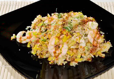 riso saltato con gamberi, verdure, uova e salsa teriyaki ( è possibile non mettere la salsa per chi è intollerante al GLUTINE specificando nella nota '' NO GLUTINE'' )