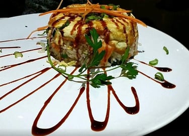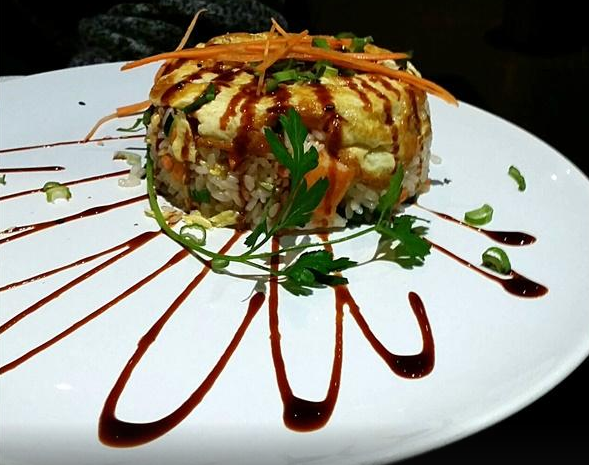 riso saltato con gamberi, surimi, verdure in fagotto di uova e salsa teriyaki
