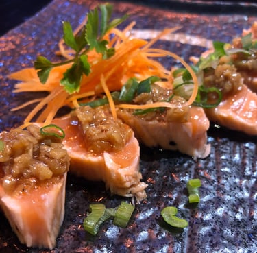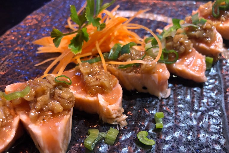 salmone scottato, salsa aglio marinato, salsa teriyaki
