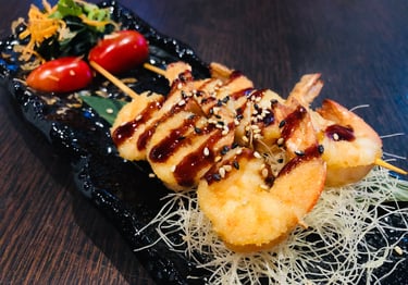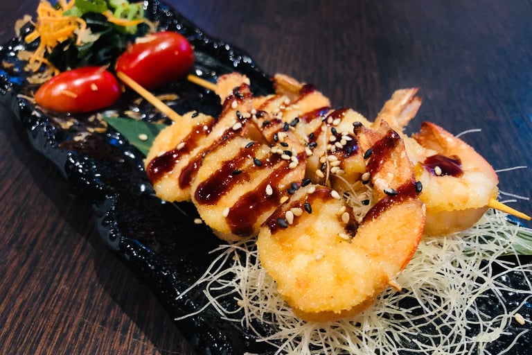 spiedini di gamberi da specificare impanati FRITTI o PIASTRA, salsa teriyaki