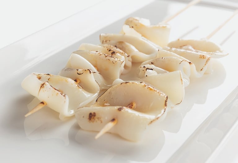 spiedini di calamari alla piastra, salsa teriyaki ( è possibile non mettere la salsa per chi è intollerante al GLUTINE specificando nella nota '' NO GLUTINE'' )